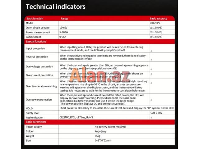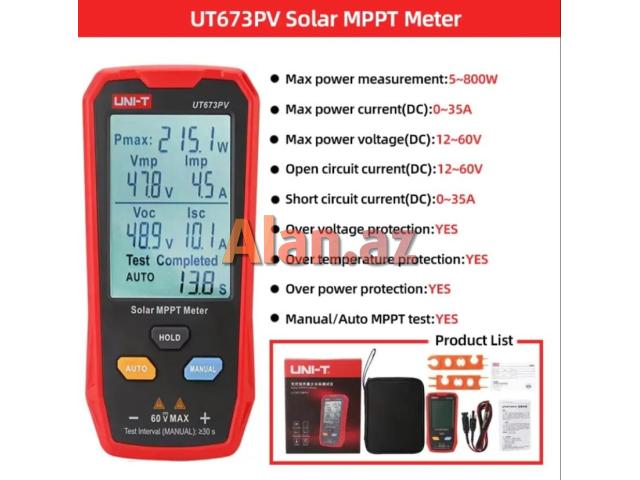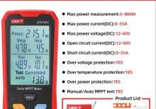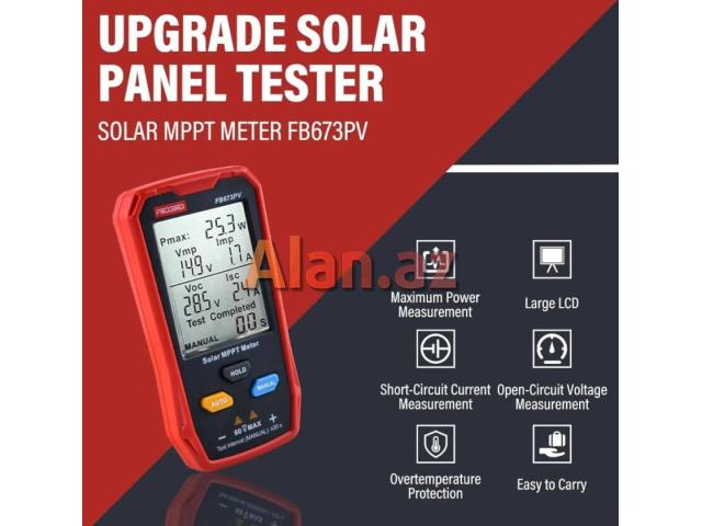 Solar MPPT meter günəş panellərindəki hər hansı anormallıqları onların pik gücünü, pik gərginliyini, pik cərəyanını, açıq dövrə gərginliyini və qısaqapanma cərəyanını sınamaqla effektiv şəkildə müəyyən edə bilər.